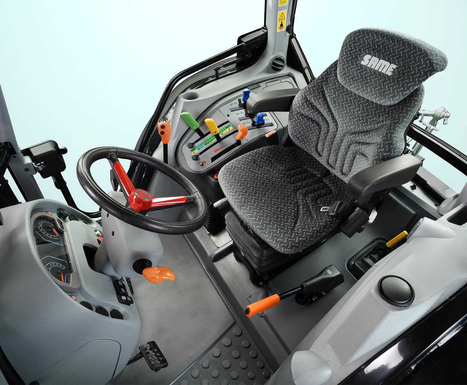 La cabina del SAME Dorado offre visibilità, isolamento dalle vibrazioni grazie ai Silent-Block, e un ambiente di lavoro comodo.