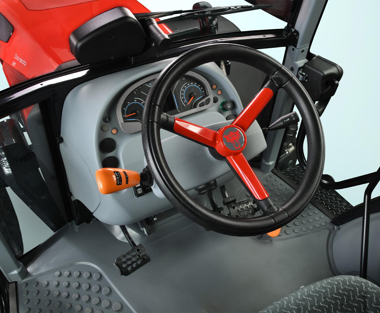 Dorado si distingue per un grande comfort. La cabina a quattro montanti offre la più ampia visibilità in tutte le direzioni e un ambiente interno comodo ed ergonomico. Il sedile di guida è dotato di sospensione pneumatica per adattarsi perfettamente al peso e all'altezza del conducente e tutti i comandi sono disposti a portata di mano. Sono disponibili due versioni di tetto, la versione standard esalta le doti di compattezza del trattore, mentre la versione "alta visibilità" esalta la visibilità frontale verso l'alto. La nuova plancia InfoCentre+ conferisce un ulteriore aspetto fresco e aggiornato all'interno della cabina. L'InfoCentre+ è dotato di due indicatori principali e di un display LCD a colori da 3,5".